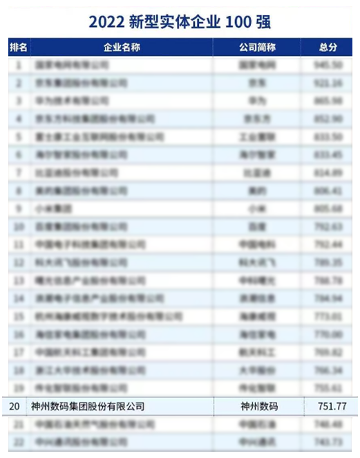 11月27日,中国企业评价协会在中国企业家博鳌论坛“中国式现代化下的新型实体企业发展之路”研讨会上重磅发布了“2022新型实体企业100强”榜单,hg57体育数码(000034.SZ)凭借强劲数字化服务能力和赋能数字经济发展的丰富实践成功入选,位列榜单第20位、现代信息技术服务企业前列。